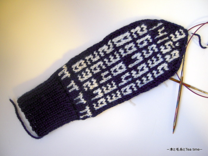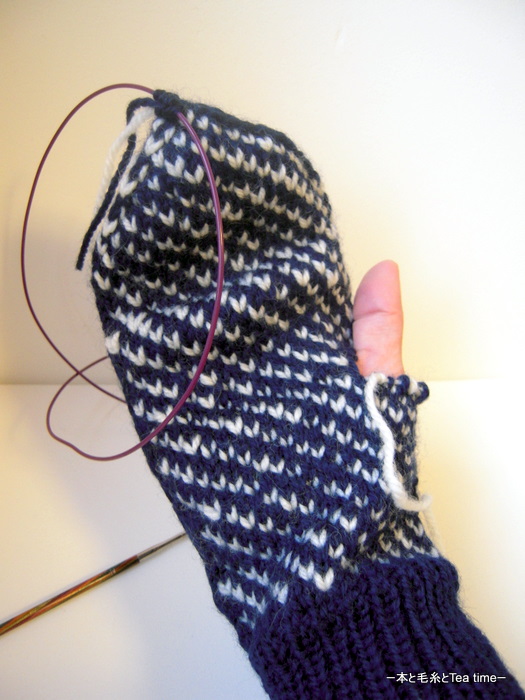 円周率のミトンの方はゴム編みが短くて絵柄部分が長かったのですが、ゴム編みを本のミトンと同じ20段にして、その分 π の上の4段を省略しました。