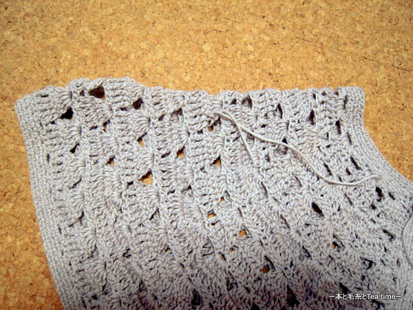 編み図では肩ひもは前と後ろから編んでいって真ん中で巻きかがりだったのだけど。