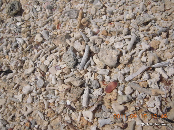 満潮時の波打ち際のラインに流木とか珊瑚のかけらや貝殻。