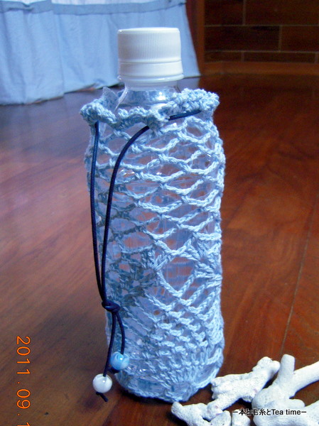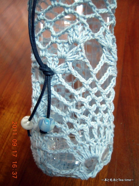 先週友人と一緒に編んだペットボトルカバーに、今日ようやく紐をつけて完成。