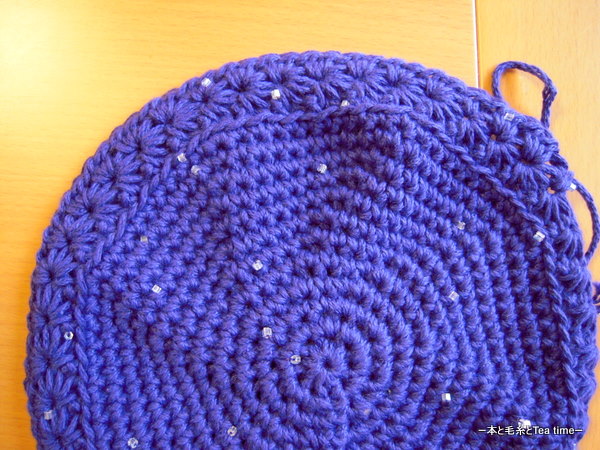 この糸はビーズ付きでキラキラ可愛いから絶対スタークロッシェ!って決めてたんだけど、コットンの割には色が紫だし(写真は青いけど、実際は完全に紫)、厚いし、夏にはちょっと暑苦しいような気もしてきてしまった。