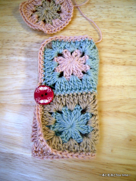 もう1つシンプルなペットボトルカバーも編んだんだけど、あとはボタンつけるだけの状態で置いてある。