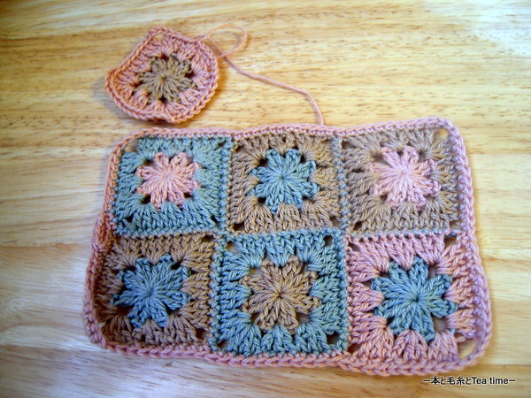 たぶんポーチになる時の配色が計算されてのこの配置なんだろうと考えて、改めてもう1枚編んだの。