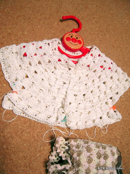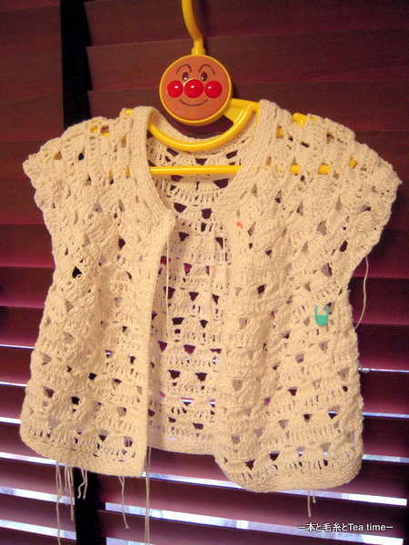 ある程度編んでから月ちゃん(仮)に着てもらったら、脇どころかお腹まで丸見えなんじゃあ?ってくらいだったのです・・・。